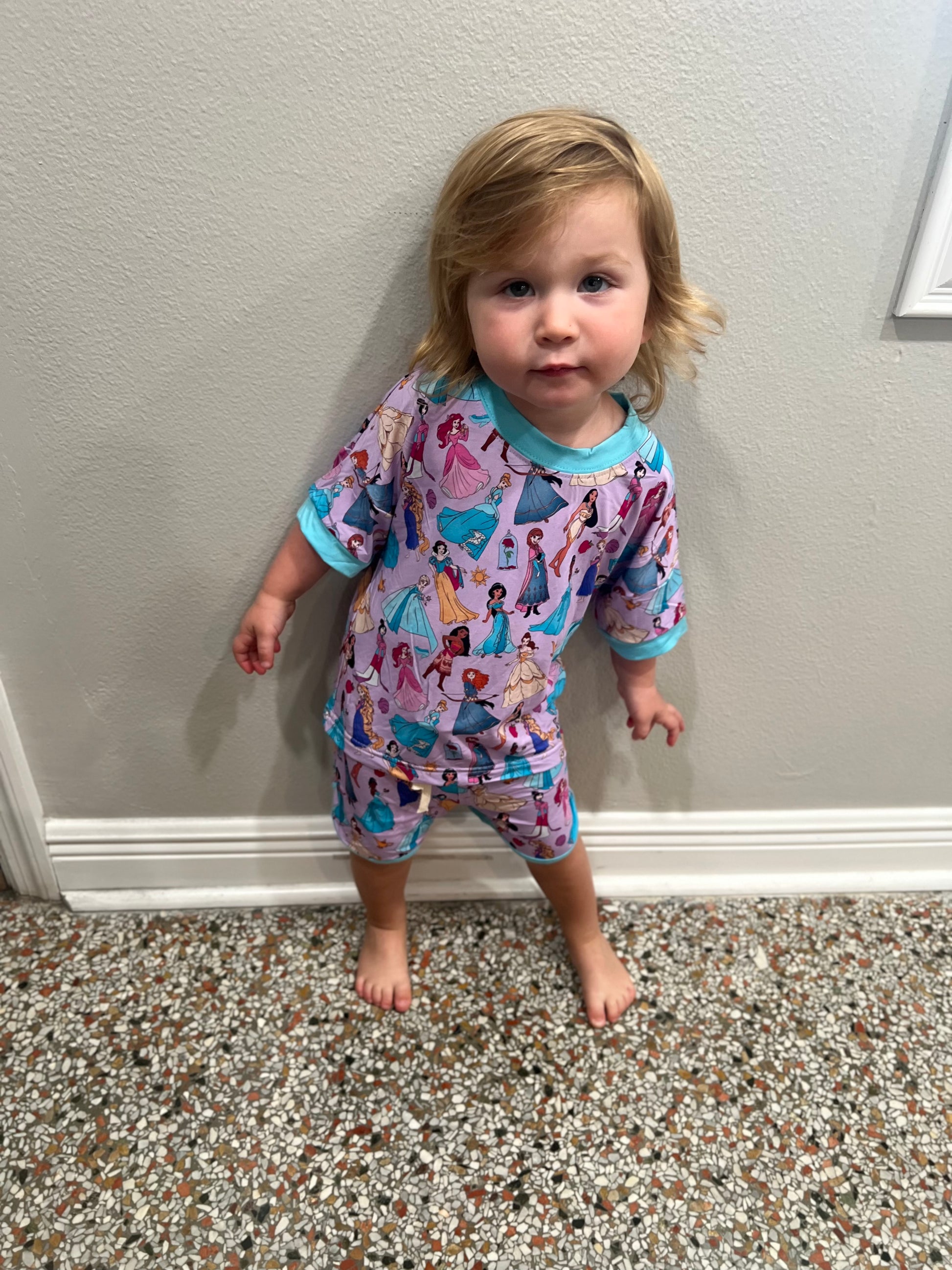 draw string shorts and oversized shirt complete with beautiful vibrant colors and all your favorite princesses.